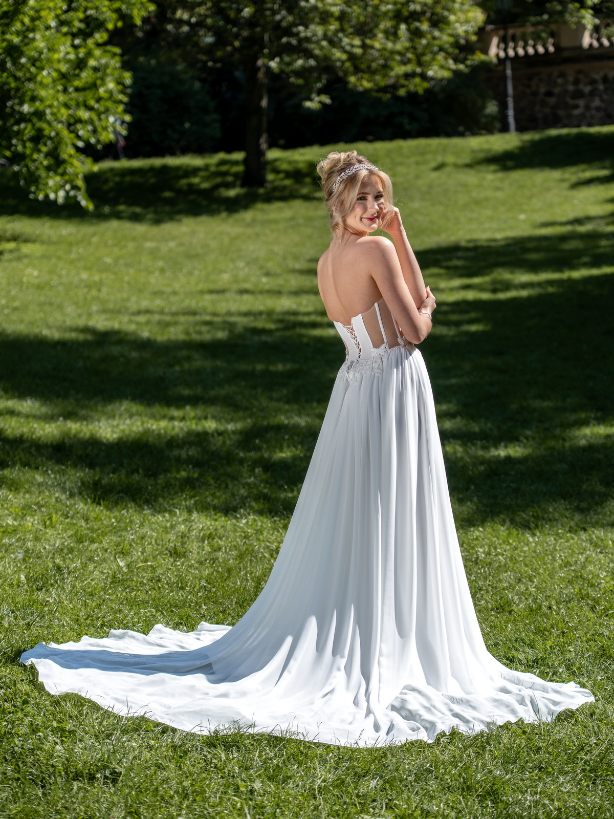Šněrovací korzet je zhotoven v kombinaci jemného saténu a průsvitného tylu, který dodává šatům na zajímavosti a přesto jednoduchosti. Celý model působí velice jemně a elegantně.